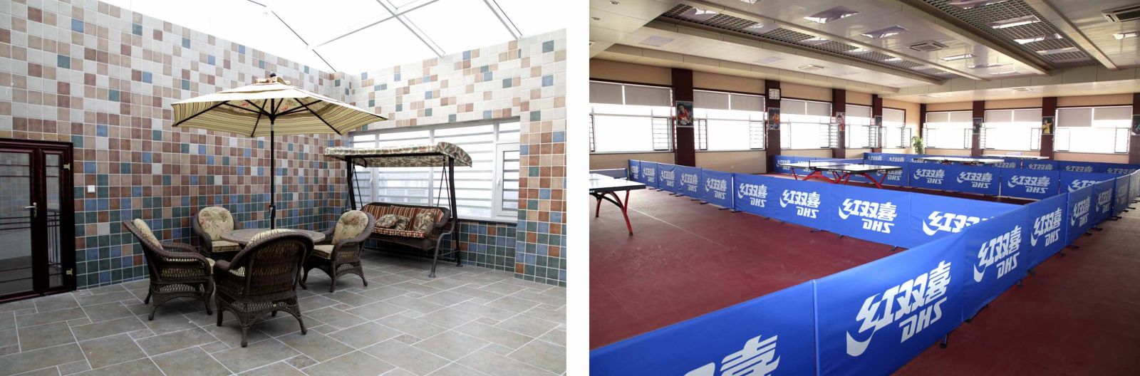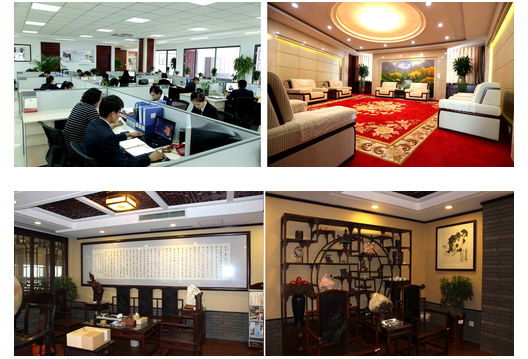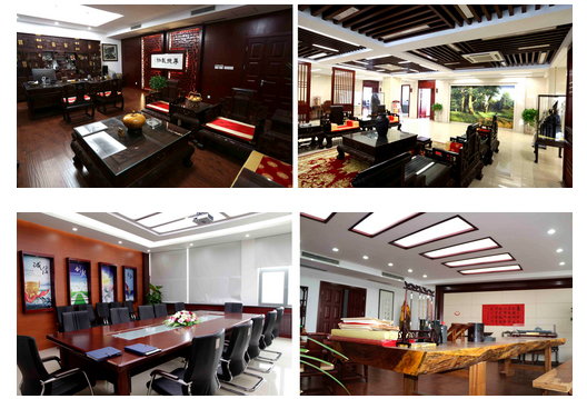 辦公樓格調高雅,富麗堂皇。公共空間墻面、地面采用進口石材裝飾。公共辦公家具采用高檔環保材質,莊重美觀,現代感十足,給人秩序井然的美感,期間又有文玩字畫裝飾,植物點綴,既創造了現代化的商務辦公氣息,又營造了人文化辦公的氛圍。茶社、中堂書畫室和部分辦公室的裝修古韻古香、充滿著古雅的色彩和情調,配以中國古典傳統文化和傳統技藝于一體的酸枝、花梨等紅木家具,體現出來中國傳統文化的獨特氣質。現代風格的活動室面積廣大,陽光充足,配以乒乓球室、跑步機、臺球、健身器等運動設施,布局合理舒適,使員工在高強度的辦公步伐之后能夠鍛煉身體,舒暢心情。
