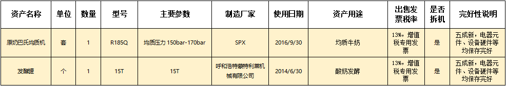 標(biāo)的一:原奶巴氏均質(zhì)機(jī)、發(fā)酵罐,起拍價(jià)格:9萬(wàn)元(含稅,稅率見(jiàn)詳情表),標(biāo)的設(shè)有保留價(jià)。