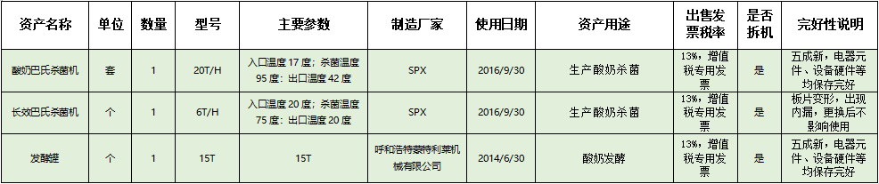 標(biāo)的二:酸奶巴氏殺菌機(jī)、長(zhǎng)效巴氏殺菌機(jī)、發(fā)酵罐,起拍價(jià)格:14萬(wàn)元(含稅,稅率見(jiàn)詳情表),標(biāo)的設(shè)有保留價(jià)。