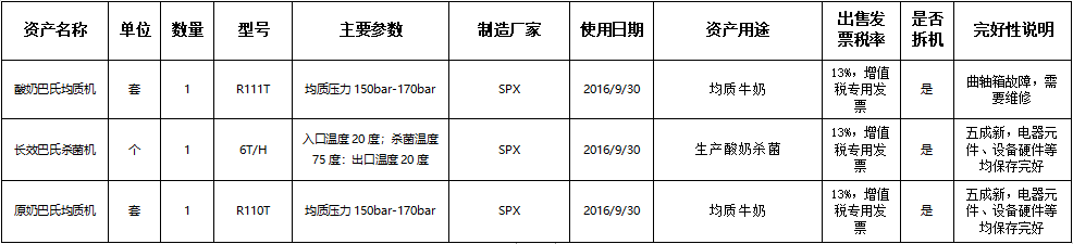 標(biāo)的三:酸奶巴氏均質(zhì)機(jī)、長(zhǎng)效巴氏殺菌機(jī)、原奶巴氏均質(zhì)機(jī),起拍價(jià)格:15萬(wàn)元(含稅,稅率見(jiàn)詳情表),標(biāo)的設(shè)有保留價(jià)。