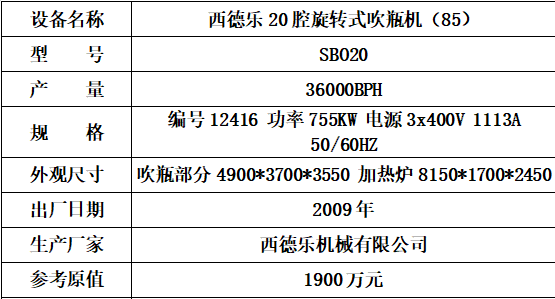 標的一:西德樂20腔旋轉式吹瓶機起拍價 144元(不含稅),標的設有保留價,競買保證金10萬元。已拆機,設備完好。