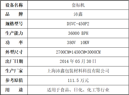 標的四:套標機,起拍價:27萬元(不含稅),標的設有保留價,競買保證金5萬元。已拆機,設備完好。