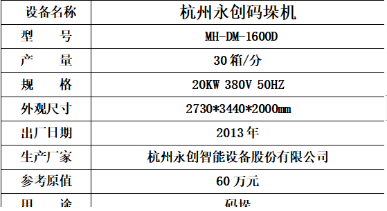 標的六:永創碼垛機起拍價:135000元(不含稅),標的設有保留價,競買保證金3萬元。已拆機,設備完好。