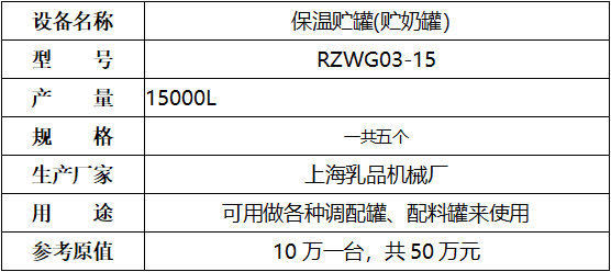 標的七:上海乳品廠5個儲奶罐,起拍價:36萬元(不含稅),標的設有保留價,競買保證金8萬元。已拆機,設備完好。