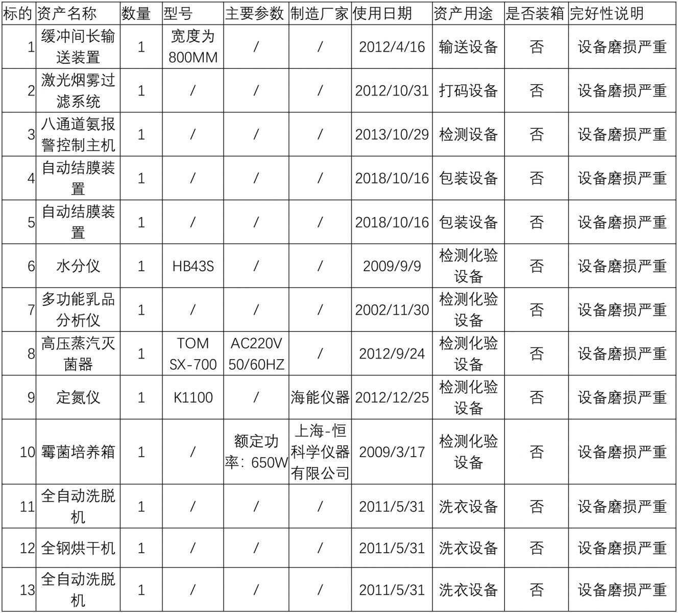 受委托,我公司將于2022年4月21日上午10時(shí)在金拍網(wǎng)平臺(tái)https://www.jinpaiwang.com.cn以網(wǎng)絡(luò)競(jìng)價(jià)的方式公開處置 輸送裝置、乳品分析儀、全自動(dòng)洗脫機(jī)、全鋼烘干機(jī)等,標(biāo)的設(shè)有保留價(jià),標(biāo)的保證金為2萬(wàn)元,起拍價(jià)55482元(此批拍賣設(shè)備不予開票)
