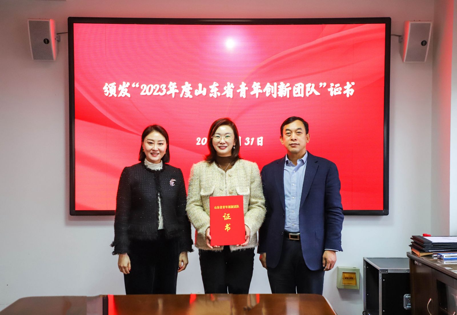 活動現場,王華杰為企業代表位琳頒發“2023年度山東省青年創新團隊”榮譽證書。