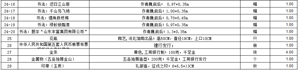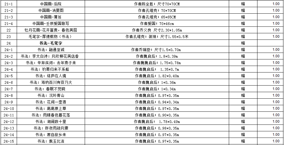 存貨物品一宗(包括木質雕刻類、玉石擺件類、字畫類等),詳見清單。參考價225.2萬元,保證金30萬元。