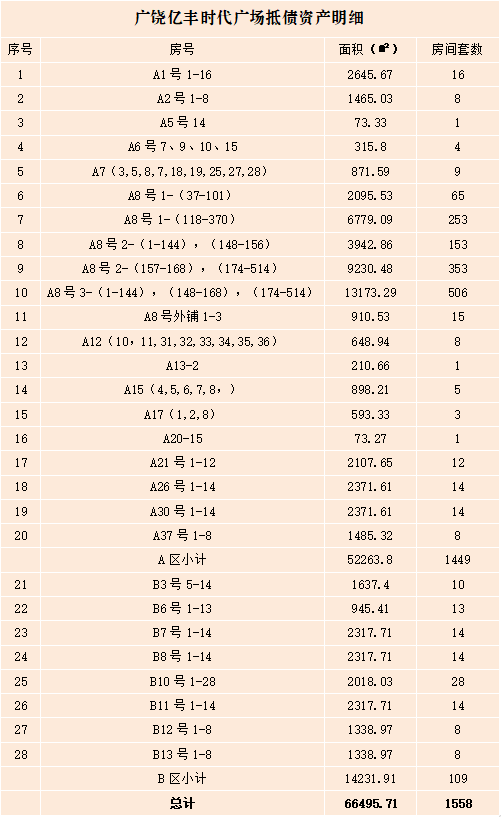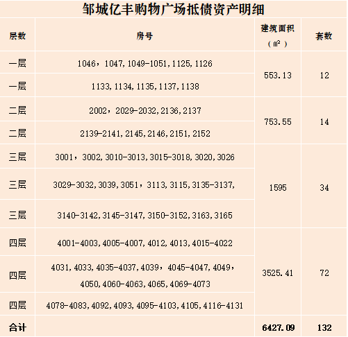 基本情況:該抵債資產(chǎn)位于東營(yíng)市廣饒縣廣饒濰高路888號(hào)億豐國(guó)際時(shí)代廣場(chǎng),廣饒老汽車站西鄰。總建筑面積66495.71㎡,房間1558套,經(jīng)法院裁定抵債,未辦理過(guò)戶手續(xù)。